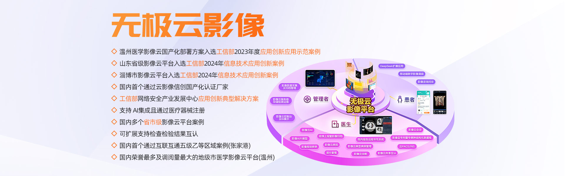 擁有多家年門診量400多萬以上人次的大型三甲醫(yī)院全院PACS及云影像案例,多個(gè)省市規(guī)模醫(yī)學(xué)影像云平臺(tái)案例,承建的溫州市醫(yī)學(xué)影像云平臺(tái)榮獲浙江省最多跑一次改革十佳案例、省領(lǐng)跑者定位題詞、全國惠民便民優(yōu)秀案例、基于影像云AI分析試點(diǎn)單位等榮譽(yù)。